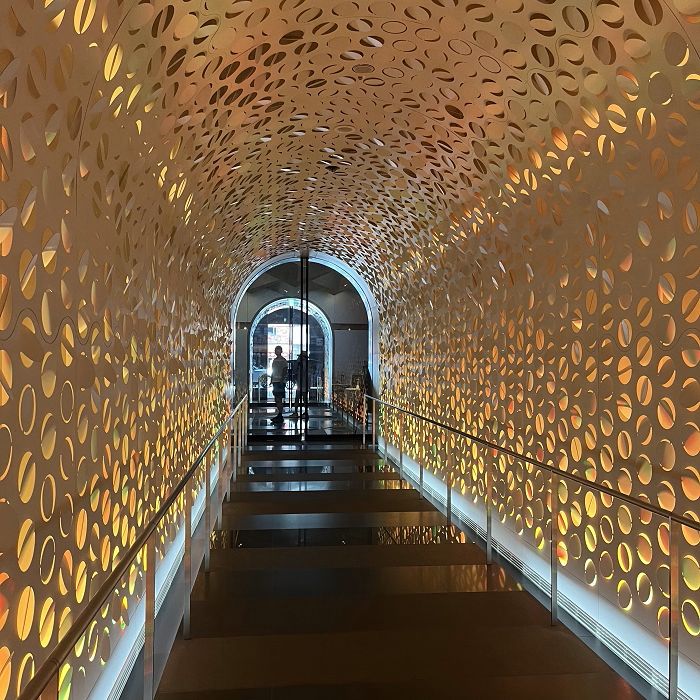 黒とシルバーの外観から一転、ホテル内に足を踏み入れると近未来的なトンネルが現れ、エントランスへと続く