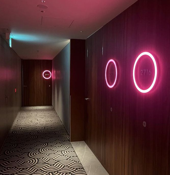 ゲストルームへ向かう通路やゲストルームにもネオンライトの装飾。滞在中も街の賑(にぎ)わいを感じることができる