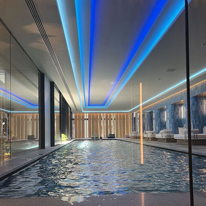 天井に備え付けられたネオンライトの光が水面に反射し、フォトジェニックな「WET」(プール)。ジェットバスやスチームサウナ(女性のみ。男性はドライサウナ)もある
