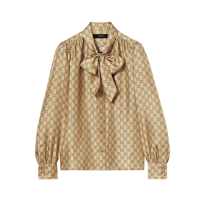 全体に施された“GG”パターンがアイコニック。ボウタイの襟元でエレガントな表情に。