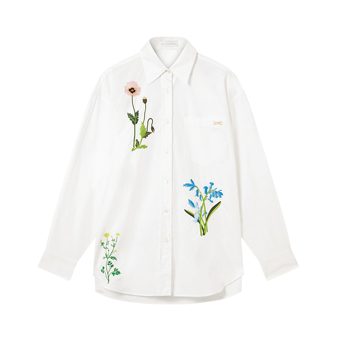 メンズライクなシャツに施された繊細なフローラル刺繍。クリーンな佇まいに詩的なニュアンスを添えて。