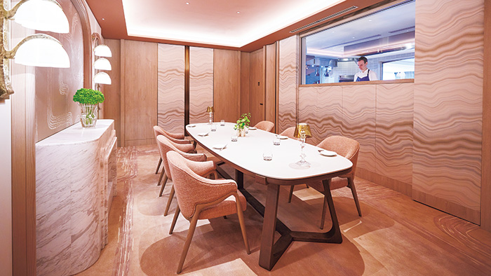 イギリス出身で、NY、パリ、香港、東京と世界の美食都市でその最高峰の技を吸収し続けている、総料理長ダニエル・カルバートが手がけるモダンフランス料理「セザン」。通常は日本料理にしか使われなかった、年に数週間ほどしか出回らない食材も使うなど、季節を映した「旬」、作り置きをせず、出来立ての瞬間のおいしさを大切にした「瞬」を映す料理として知られる。日本や中国など、アジアの料理法も柔軟に取り入れるカルバートシェフ。緻密で美しい仕事ぶりと「味」に焦点を当てたアプローチで、2021年のオープンから、わずか3年でミシュラン三つ星に輝く注目店だ。