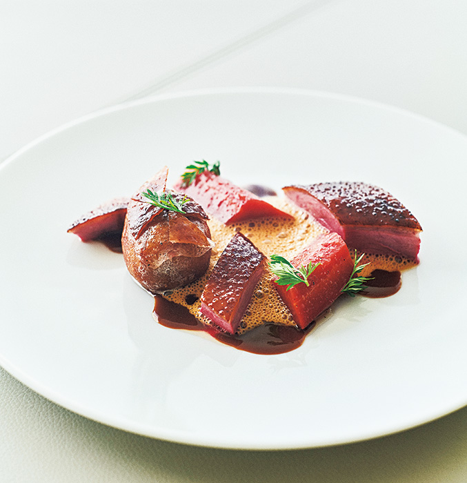 モナコの三つ星店「ル・ルイ・キャーンズ」で1987年にいち早く野菜だけのコース料理を生み出し、地球にも人にも優しい健康的な食の先駆者としても知られるアラン・デュカスシェフ。その哲学を受け継ぐのが、20年以上その薫陶を受けてきた小島景シェフ。パレスホテル東京内にある「エステール」では、そんなデュカスシェフの哲学を形にするべく、毎朝自ら鎌倉の市場で仕入れた野菜を使い、素材の力強さを感じる料理を提供する。魚は一本釣りなど、サステナブルな漁法でとれたものだけ、肉も脂の少ないものを使うなど、皇居外苑の緑を望む窓からの景色と相まって、自然と共生する豊かさまでもが、味わいの一部になっている。