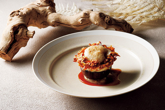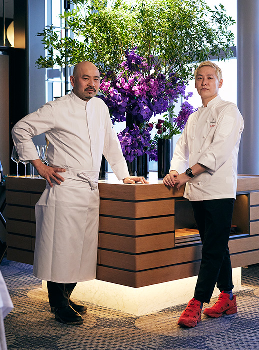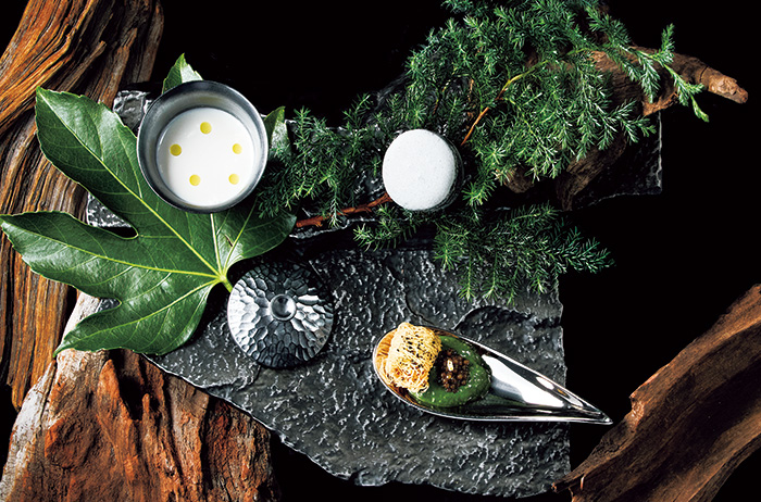オーナーシェフとして「Restaurant KEI」で、フランスでアジア人初の三つ星の評価を受けた小林圭シェフ。「エリタージュ」とはフランス語で遺産という意味。エレガンスあふれるザ・リッツ・カールトン東京内で、伝統的な料理を継承しつつ、小林シェフならではの感性で現代的に革新している。一つのキーとなるのが、日本的な感性の織り込み方。その時々の草花などで季節感を表現した、八寸を思わせる盛り付けのアミューズは、東京の都心にありながら、日本の四季とのつながりを感じさせてくれる。村島輝樹料理長は、元々自らの店もミシュランの星の評価を受けていた実力派。魚でも季節感を感じてもらおうと、豊洲市場に毎日早朝に足を運んで自ら買い付けるなどして、日本の豊かな自然を表現している。