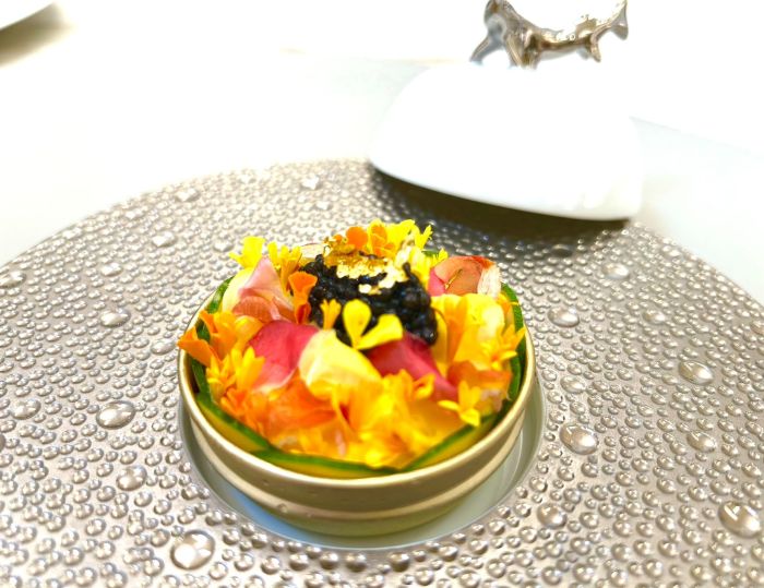 3品目は「私のスペシャリテ」で、フラワーガーデンのような美しさ。ズッキーニのシャルロットに、カニと白菜のエチュベ、カボチャのエスプーマにイタリア産のオシェトラキャビア、エディブルフラワー、レモンのコンフィチュールを合わせている。添えられているのは、瞬間燻製(くんせい)したタプナードのワッフルだ。