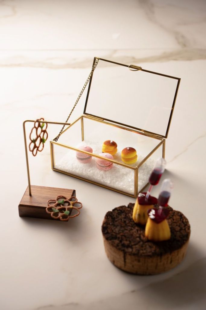 ジュエリーボックスに収められているのは2種のマカロン。糸島産の豚のリエットを間に挟んだバラの風味と、イタリア産ペコリーノロマーノのチーズを利かせたカレー風味だ。イヤリングスタンドにかかるフワラーモチーフはポルチーニ茸のチュイール。小さなハート形のレモンピールが爽やかな酸味を添える。