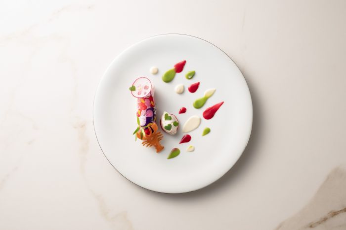 続く一皿は「愛の色」と名付けられた魚の前菜。ブルターニュ産オマール海老と西米良産サーモンのタルタルをクスクスと一緒にフラワーロールにして、パイナップルのコンポートをゼリーにしたものやエシャロットが入ったパイナップル風味の生クリームを合わせている。ブロッコリーのグリーン、ビーツの赤、蕪の白のソースを絵具にして描き出した鮮やかな模様も楽しい。これらの彩りが表すのは“初恋の色” 。オマール海老をかたどったチュールやところどころにあしらわれたハートモチーフの葉など、細かいあしらいにも注目してほしい。