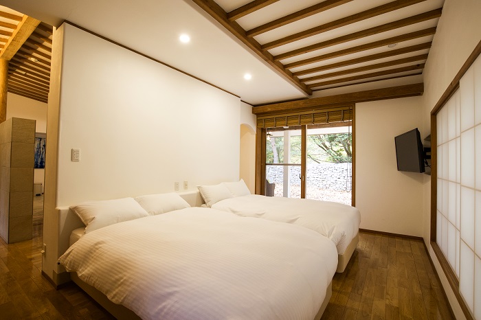 ヴィラスイート102号室/広々としたベッドルームからもテラスが見え、愛犬を守れるのも安心