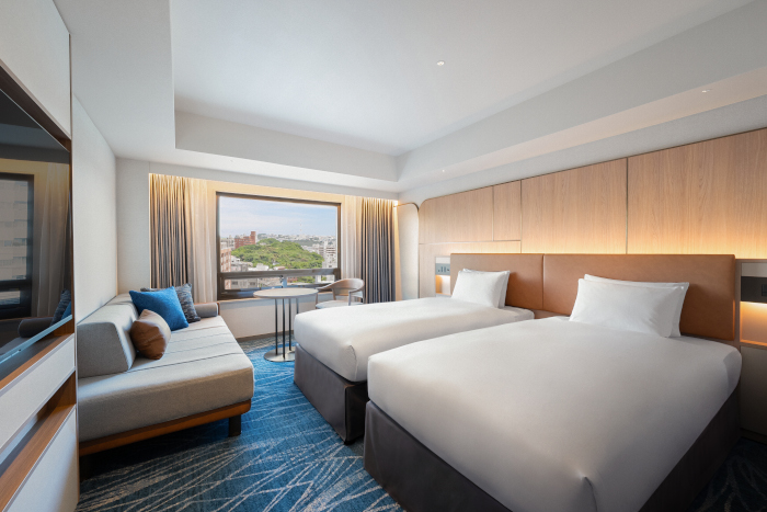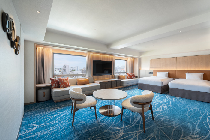 客室は、琉球テイストを現代的にアレンジしたデザインへと刷新。沖縄の伝統工芸「琉球藍染」から着想を得た、深みのある藍色のカーペットが敷き詰められている。家族やグループでの滞在に最適な「クラブエグゼクティブツインルーム」には、バルミューダの電子レンジや冷蔵庫、ドラム式洗濯乾燥機などが設置され、長期滞在もより快適に。