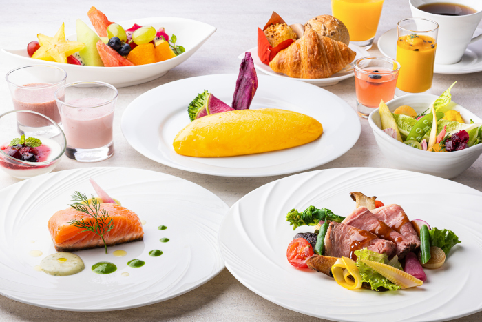 また、ホテル最上階に位置するクラブラウンジは、那覇市内最大級の広さに。朝食では、オムレツやローストビーフなど、注文ごとに調理した出来立てのメニューを日替わりで提供。ティータイムにはスイーツが用意されているほか、バンズやパン、具材を自由に選び、オリジナルのサンドイッチを作ることができる。