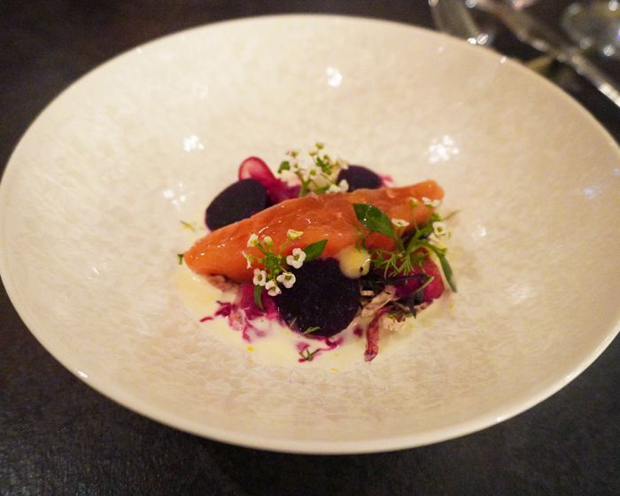 白馬湧水岩魚と氷温熟成じゃが芋を使った濃厚なスープや、白馬の湧水で活け締めした信州サーモンと雪中ビーツを使った魚料理、そして白馬で育てられた小麦粉「ゆめかおり」で作ったキターラを用いたボロネーゼなど、どの一皿からも白馬の恵みを感じられる。