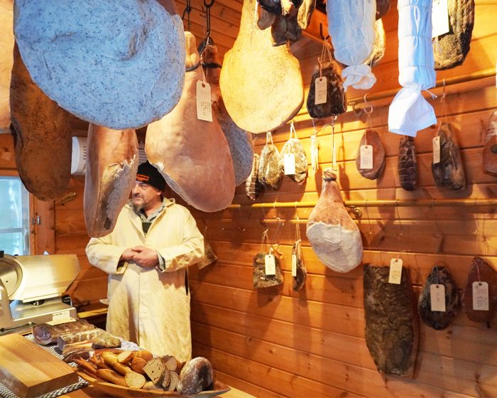 一面にハムや熟成肉がつり下げられている室内は圧巻の光景。もちろん全て食べられる本物の肉だ。伝統的なヨーロッパの製法と白馬の山々がもたらす自然環境を生かした少量生産のハムや熟成肉の数々。素材や熟成日などが記されており、全てがまるで実験するように作られている。中には仕込みだけで1か月以上かかるものも。