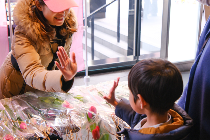 来街者に無償で2本の花をプレゼントする本イベントは、「花をもらう喜び、贈る喜び、そして飾る喜び」を多くの人に体感してもらうことで、花のある生活の魅力や花への関心を呼び起こし、行き先がなく残ってしまう花 (廃棄予定の花)を減らすことを目的としたもの。