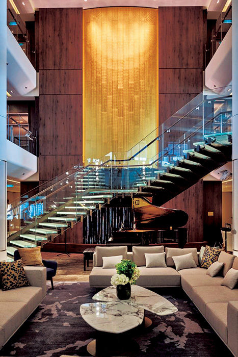 この新造客船は、故・矢萩春恵氏が揮毫した「飛鳥III」の文字が船体に輝き、「飛鳥II」でも船内のアートや伝統工芸品の展示を行ってきたアート専門会社がキュレーションを手がける。「飛鳥III」のアトリウムに燦然と輝くのは、人間国宝の漆芸家、室瀬和美氏が手がけた高さ約9m・幅約3mの大作、「耀光耀瑛(ようこう・ようえい)」。ややカーブをつけた132枚もの漆塗りの板を使い、見る角度によって表情を変える。さらに館内に展示されている数多くのアート作品は購入することも可能。5階から13階までの階段には日本画壇を牽引する土屋禮一氏の手による大作が飾られている。階を移動する度に空の表情が変わってゆく様を表したもので、一歩デッキに出れば、大空とつながる感覚を覚えるクルーズの開放感が、船内に居ながらでも感じられる。