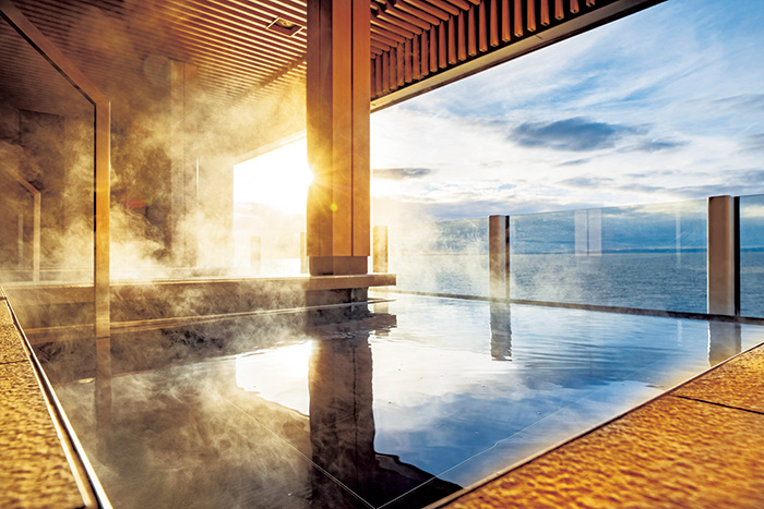 「飛鳥III」は、時代性を配慮してウェルネスにも特化。船体のバランスを取るのが難しいためこれまでに実現しなかった、船首、しかも12階という高層部に作られた「グランドスパ」は、浴槽につかりながら、まるで操舵室にいるかのような視点で、目の前で紺碧の大海原が割れ、白波を立てて進む爽快感も満喫できる。「飛鳥III」ならではのダイナミックさと究極のくつろぎ感は、「飛鳥」クルーズのアンバサダーでもある放送作家・小山薫堂氏が提唱する「湯道」、日本の入浴文化の魅力を遺憾無く表している。