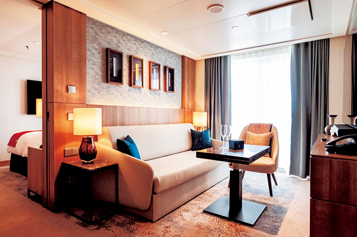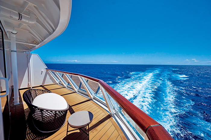 歴史を振り返っても「夢と憧れ」は、「飛鳥」クルーズの前身として活躍した数々の日本郵船の客船を象徴する言葉と言える。1885年の設立以来、日本郵船は人々の夢を乗せて旅を続けてきた。海外旅行が多くの人にとって一世一代の大冒険だった時代、その船上にいたのは、チャールズ・チャップリンやアインシュタイン、ヘレン・ケラーなど、時代を象徴する錚々たるメンバー。世界有数の海運国として名を馳せた日本だからこそ、船としての精度や機能性はもちろん、調度品やホスピタリティに至るまで、日本の威信をかけ、世界にその文化を伝える舞台でもあった。今回のグループ会社である郵船クルーズの新造客船は、未来へとその輝きをつなぐ一大事業だということができる。飛行機での旅が当たり前になった今でも、船の旅でしか味わえないものがある。それは、ただの移動ではなく、そこで過ごす時間そのもの。全客室にプライベートバルコニーとバスタブがついており、くつろぎの時間を過ごすのにぴったりだ。
