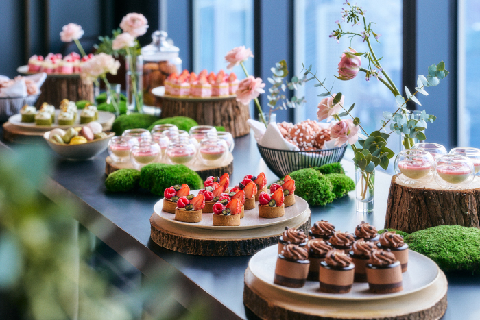 デザートは、桜のショートケーキ、コニャック⾹る桃のパンナコッタ、3種のベリーの酸味にコクのあるバニラディプロマットクリームを合わせた「ベリーのタルト」など、春らしいスイーツがずらりと並ぶスイーツビュッフェに。