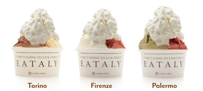 ジェラートで巡るイタリア〈左 〉コッペッタ・トリノ ¥1,100〈中 〉コッペッタ・フィレンツェ ¥1,000〈右 〉コッペッタ・パレルモ ¥1,100 【提供店舗】イータリー銀座店「GRAN CAFFÈ VERGNANO 1882」、丸の内店・日本橋店・原宿店「CAFE&COUNTER」